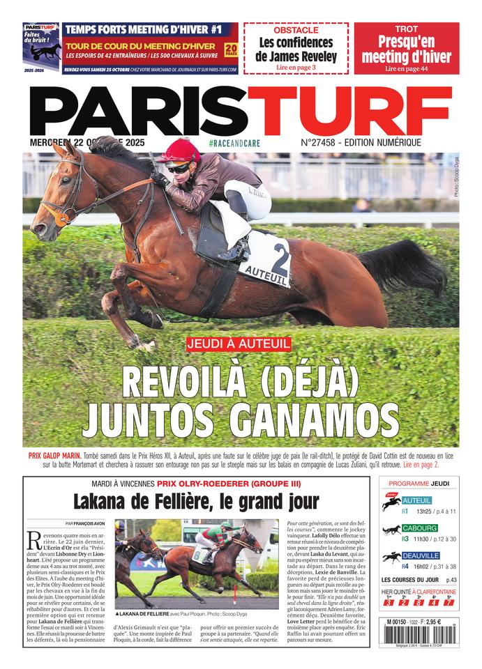 Cinq jours seulement après avoir éjecté son partenaire dans le Prix Héros XII, le protégé de David Cottin sera de retour en piste sur les haies de la butte Mortemart dans le Prix Galop Marin. Juntos...