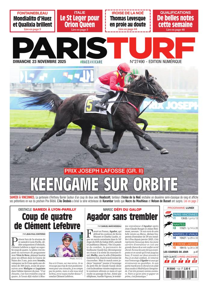 Favori en France, Agador, qui défend les couleurs de Kevin Moysset et Charley Laufer, signe un succès autoritaire dans la 16e étape du Défi du Galop 2025, samedi à Casablanca (Maroc). Vite à la pointe...